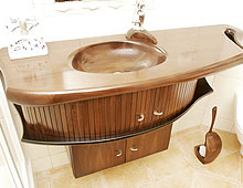 Раковина ARPY ,выполненная из американского ореха с простором для откладывания и с роликовой шторой, которая закрыает сифон.Туалетная щетка, держатель для туалетной бумаги, вешалка для полотенец и полки, придавают окончательный деревянный вид ванной комнаты.